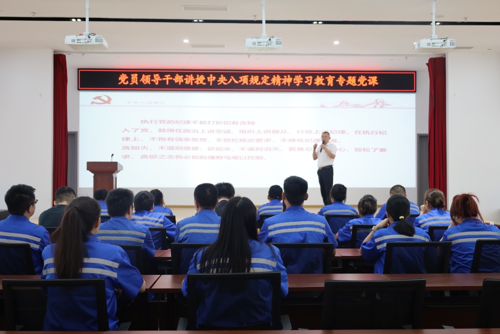 ? ? ? ?為深入貫徹落實全面從嚴(yán)治黨要求,持續(xù)鞏固深化作風(fēng)建設(shè)成果,引導(dǎo)黨員干部強化紀(jì)律意識、筑牢思想防線,7月4日,蜀能礦產(chǎn)磷酸鐵鋰廠開展深入貫徹中央八項規(guī)定精神學(xué)習(xí)教育專題黨課,公司黨支部宣傳委員、總經(jīng)理助理,磷酸鐵鋰廠副總經(jīng)理萬洪勝授課,磷酸鐵鋰廠在家班子成員,全體黨員、發(fā)展對象、入黨積極分子及重點崗位人員等30余人參加。