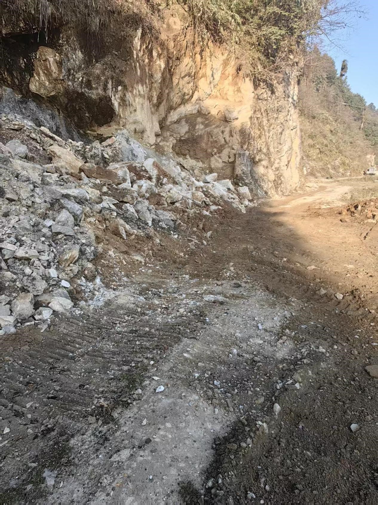 ? ? ? ?險情就是命令。2月20日(農歷正月初四)上午8:30分,公司值班領導安全總監(jiān)庫啟賢報企業(yè)主要負責人同意后立即啟動應急預案,公司黨總支書記、董事長徐開貴組織召開應急處置部署(視頻)會,明確初步處置方案并成立現場處置小組,落實工作分工并同步向屬地政府及上級主管部門報告險情。馬邊縣委政府迅速響應,建立“地企聯動”應急機制,形成縣自然資源局、應急局、煙峰鎮(zhèn)、蜀能礦產等多方協(xié)同的應急處置合力。地企雙方迅速對危險區(qū)域實施臨時交通管制,設立警戒線和警示標識,安排專人24小時值守,嚴禁人員車輛進入危險區(qū)。聯合指揮部緊急調集技術人員現場會商,確定“主動排除險兆,源頭消除隱患”的處置原則,決定采取機械破碎方式對危巖進行分層、分段清除現場處置方案。2月21日17時40分,經過現場近4小時的科學緊張作業(yè),危巖成功破碎清理完畢,道路恢復正常通行,險情徹底排除。