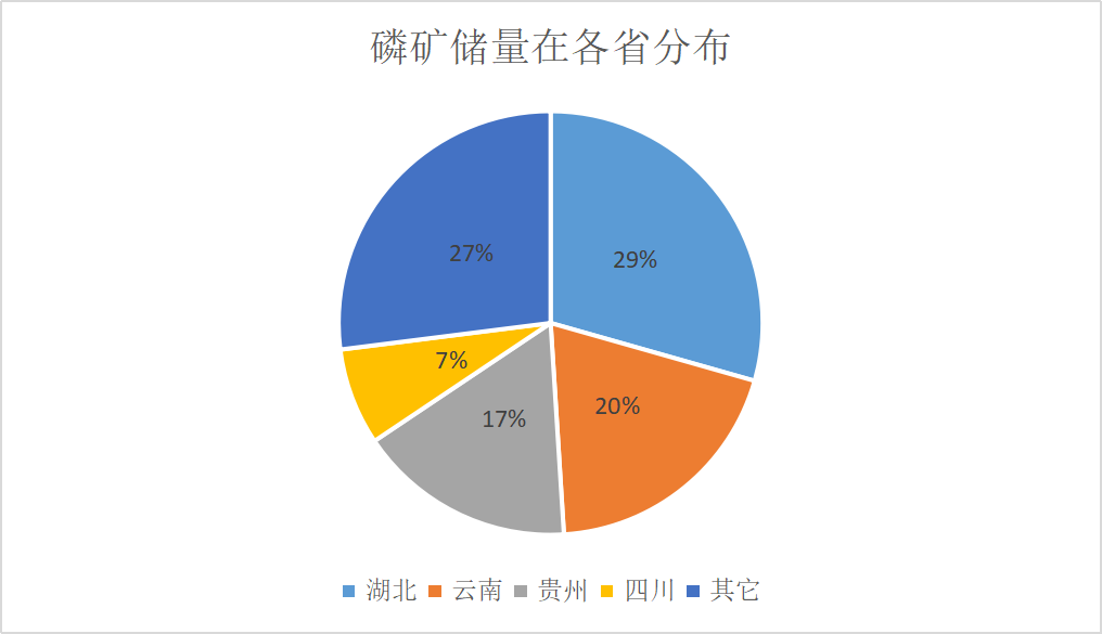 ? ? ? ? 我國(guó)是全球磷礦儲(chǔ)量第二的國(guó)家,磷礦資源主要分布在湖北、云南、貴州、四川等省份。從占比上看,湖北省磷礦約為63.4億噸,占比為29.4%;云南儲(chǔ)量約為40.2億噸,占比約為18.6%;貴州儲(chǔ)量約35.8億噸,占比約16.6%,四川省儲(chǔ)量占比較小,約為7.4%。